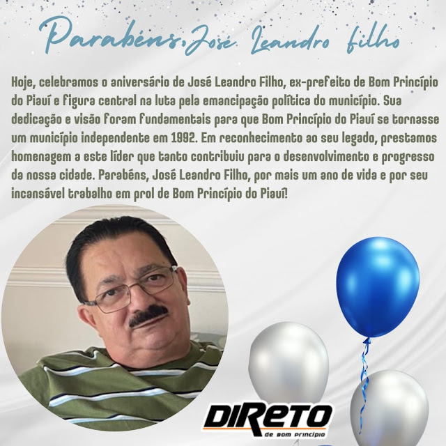Parabéns ao ex-prefeito de Bom Princípio do Piauí, José Leandro Filho, pela passagem de seu aniversário! Que esta data seja repleta de alegria, saúde e muitas felicidades. Seu legado e dedicação ao município são lembrados com gratidão por todos os cidadãos. Que o futuro lhe reserve ainda mais conquistas e momentos especiais.